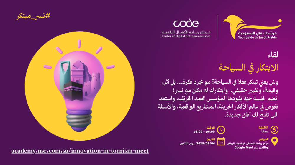 في لقاء "الابتكار في السياحة"، نأخذك في رحلة من الشغف إلى التنفيذ، من الخيال إلى الأثر، في جلسة حيّة يقودها مؤسس نسر والرئيس التنفيذي محمد الخريّف، أحد رواد الابتكار السياحي، والحائز على المركز الأول في مسابقة منشآت لريادة الأعمال.